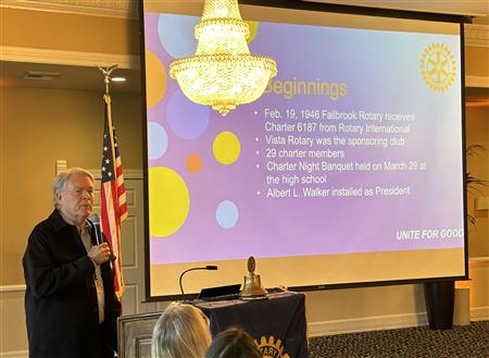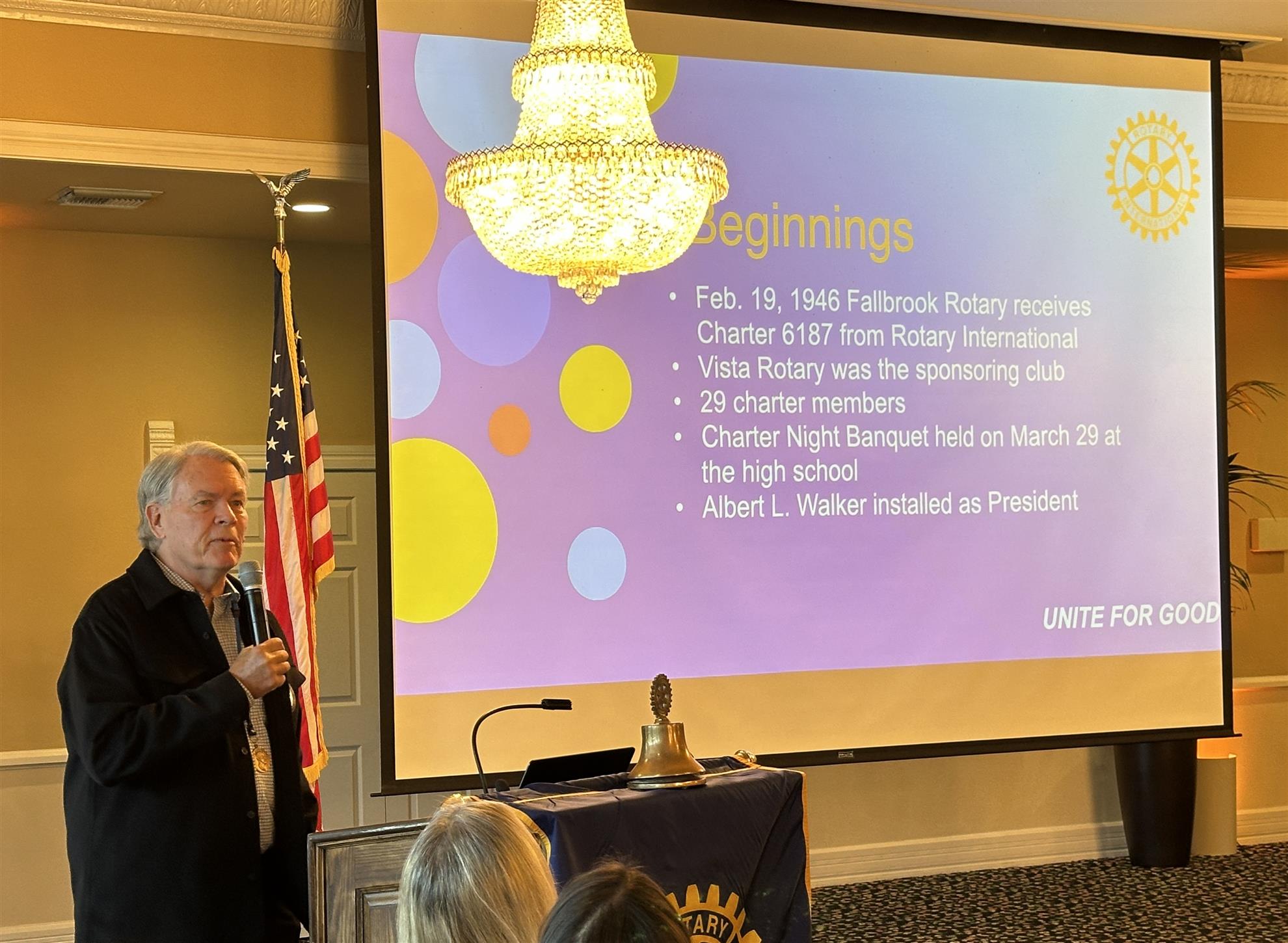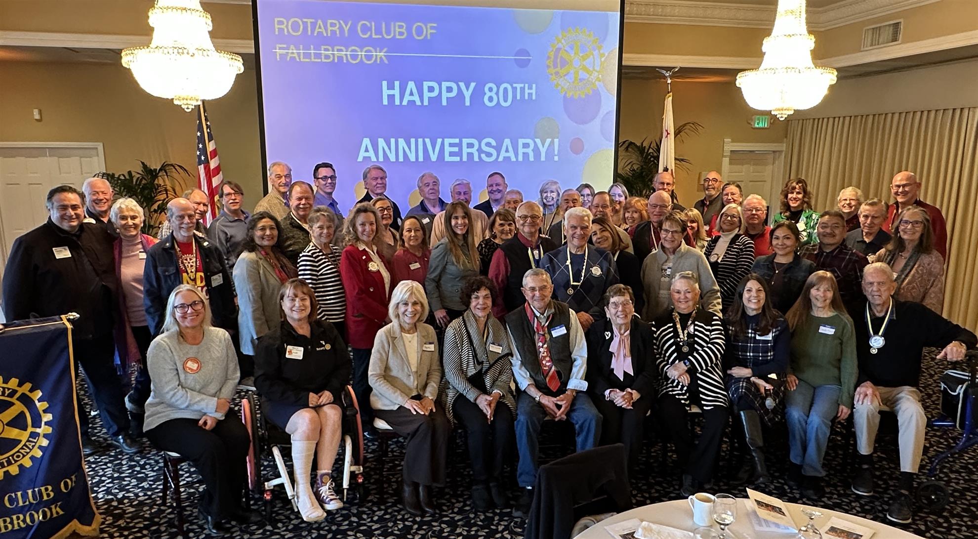 80 Years Young! The Rotary Club of Fallbrook celebrated in style on February 19. Our club was founded on February 19, 1946 making this our club’s 80th anniversary. We welcomed past presidents, recognized our Paul Harris Fellows, and District 5340 Governor Luis Carranza joined us to offer his congratulation. Our speakers shared club history and reminded us of the accomplishments through which we make our club motto, Service Above Self, a reality. Here’s to another 80 years!
