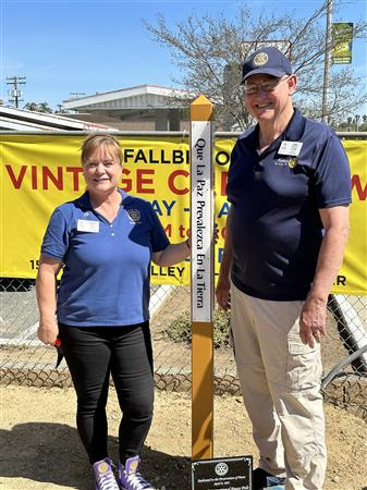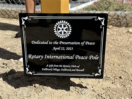 The Rotary Club of Fallbrook, Bonsall Rotary, and the Fallbrook Village Rotary have joined together to purchase and install a Peace Pole. The Peace Pole is a monument that displays the messages "May Peace Prevail on Earth" and “May Peace be in our Homes and Communities” in both English and Spanish. Our Peace Pole is located in Heritage Park, just off Main Ave. in Fallbrook.